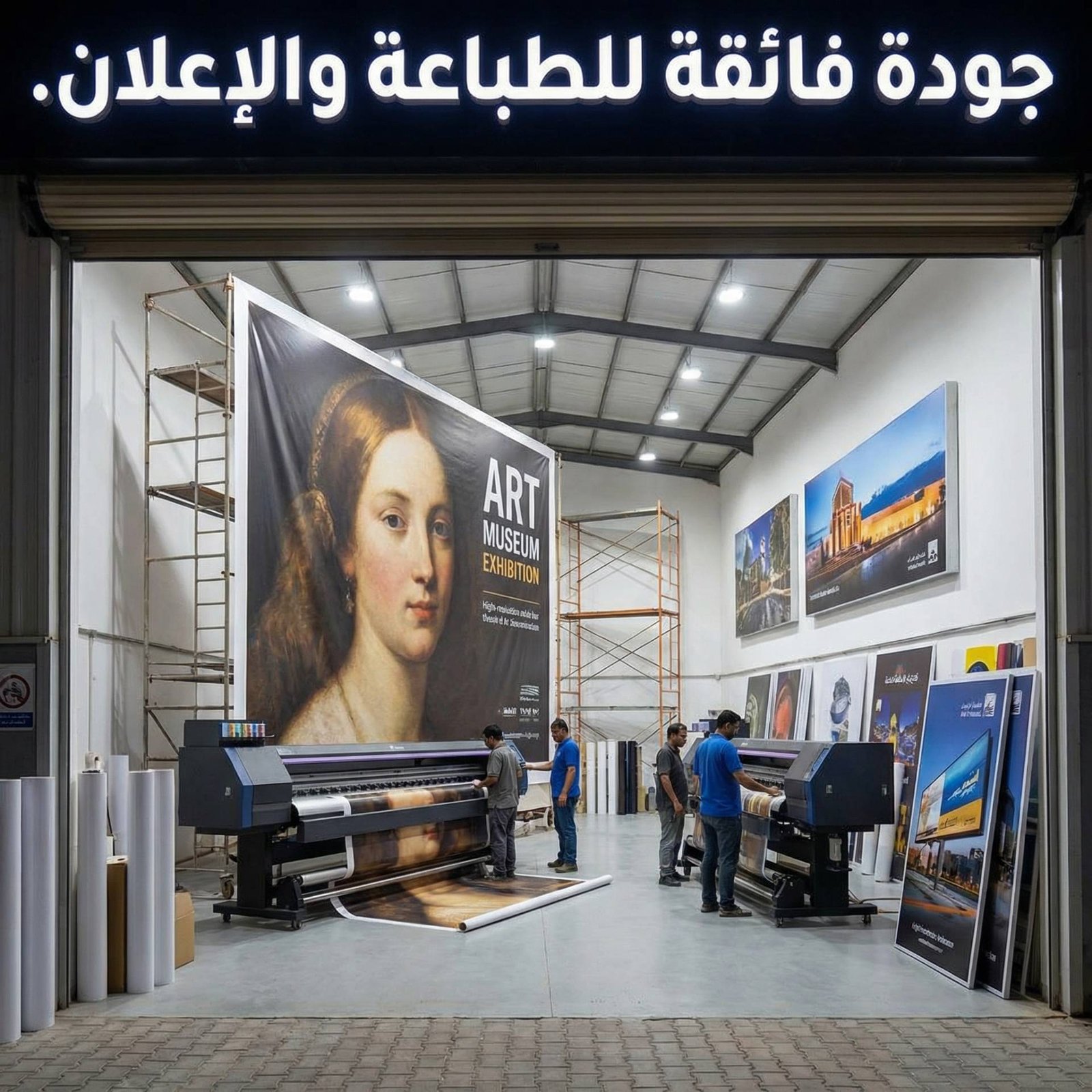 طباعة داخلية وخارجية مقاومة للعوامل الجوية بأحجام متعددة تناسب المعارض والمحلات.